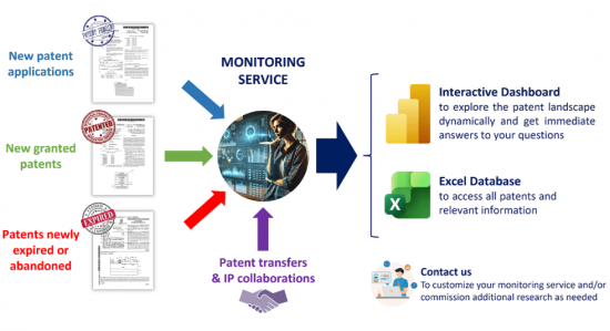 - Quarterly updates of the database and dashboard, including new patent applications, newly granted patents, expired or abandoned patents, and IP collaborations, with a focus on key highlights on emerging trends, key players, and technological developments.