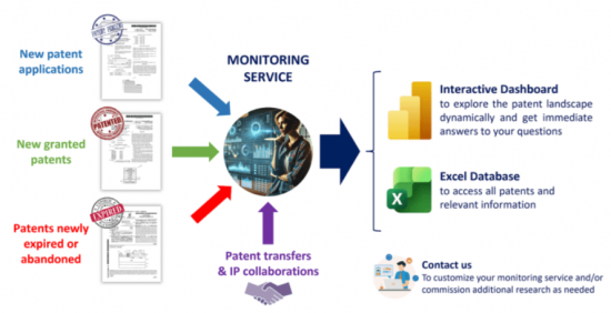 - Quarterly updates of the database and dashboard, including new patent applications, newly granted patents, expired or abandoned patents, and IP collaborations, with a focus on key highlights on emerging trends, key players, and technological developments.