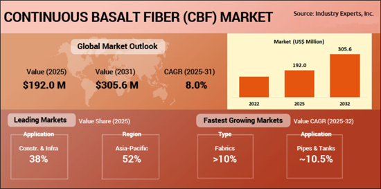 This global report on Continuous Basalt Fiber (CBF) market analyzes the global and regional markets based on product form and application for the period 2022-2031 with forecasts from 2025 to 2031 in terms of value in US$. In addition to providing profiles of major companies operating in this space, the latest corporate and industrial developments have been covered to offer a clear panorama of how and where the market is progressing.