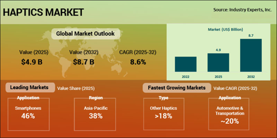 The global haptics market is poised for significant growth, expanding from US$4.9 billion in 2025 to nearly US$8.7 billion by 2032, at a CAGR of 8.6%. Growth is underpinned by rising adoption of advanced haptic feedback technologies in smartphones, gaming, automotive, wearables, healthcare, and the metaverse. While smartphones remain the largest market, demand is shifting towards automotive applications and immersive digital experiences, reflecting the industry's transition beyond traditional mobile use cases.