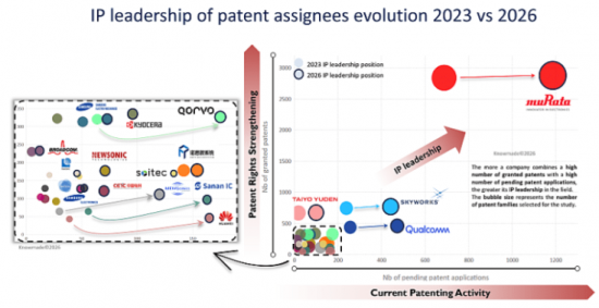 The RF acoustic wave patent landscape is undergoing a gradual shift in IP leadership. While long-established players such as Murata, Skyworks, Qualcomm and Taiyo Yuden continue to anchor the landscape with strong granted portfolios and long-standing expertise in acoustic filtering technologies, other companies are increasing their patenting activity and expanding their technological coverage across multiple acoustic platforms. In particular, the most dynamic momentum is visible within the Chinese ecosystem, where several players have significantly accelerated their filings in recent years. This evolution reflects a progressively more competitive and geographically diversified innovation landscape in RF acoustic wave technologies.