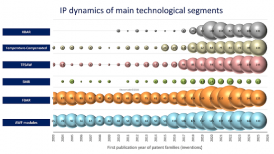 Since around 2015, a new wave of emerging players, many of them Chinese entities, has built increasingly competitive portfolios in resonator platforms, materials engineering and RF integration technologies. More recently, a new layer of IP newcomers has appeared after 2022, further increasing competitive density in emerging high-frequency domains such as TFSAW, XBAR and advanced acoustic stacks. The progressive arrival of new actors indicates that the RF acoustic wave landscape is entering a phase of intensified competition, where leadership will increasingly depend not only on portfolio size but also on technological positioning and the ability to scale innovation across the RF front-end value chain.