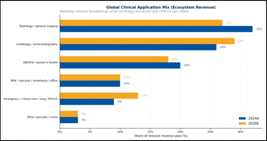 - The global ultrasound ecosystem expands from $12.5B (2024A) to $21.5B (2035E), as the market broadens beyond hardware into service, workflow, and AI-linked monetization.