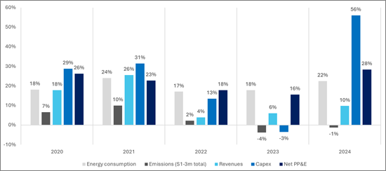 This report analyzes 20 leading webscalers, presenting financial metrics (revenues, capex, and net PP&E) alongside energy-related indicators: total energy and electricity consumption, renewable energy share, and greenhouse gas emissions (Scopes 1, 2, both location- and market-based, and 3). Data cover 2019-2024, supplemented by derived metrics that illuminate energy use and sustainability trends.